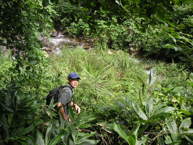 ![]() | ここからが本日のメインミッション「沢上り」。もともとは、去年の10月に、古屋敷の築200年の日本家屋のオーナー、花屋さん(70歳)に、「ここから萱滝までは歩いて登れる」と聞いたことがきっかけです。その時から沢登りするぞ!と思っていたのがついに実現しました。萱滝までの最後の橋から、藪をかきわけて川におります。 |