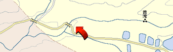 ![]() | 降りる道なんてないので、どこから降りるかがちょっとわかりにくいんだけど、萱滝からこのポイントまで歩いて下ると10分もかからないぐらいの距離。この地図はマピオンから。実はこんな山奥の道でもかなり詳細。左の方角が古屋敷村。 |