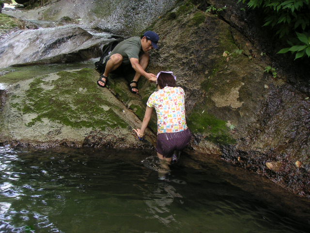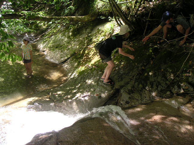 ![]() ![]() | 花屋さんは、ここから登れば全然危なくないと言っていたのですが、山元のヌクイの大岩の先の滝までに比べれば低いものの、それでもサバイバル度はなかなかに高いです。ビーチサンダルだと危ない、というか滑って登れないところがあります。 |