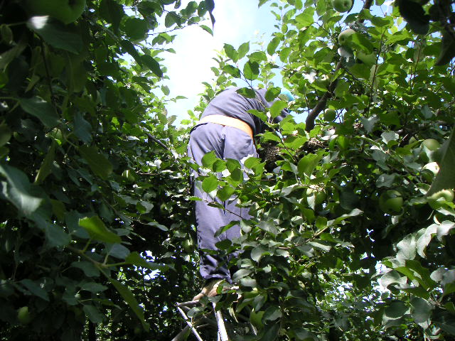 ![]() ![]() | 脚立にのって徒長枝(トチョウシ)を切っているところ。徒長枝とは、果樹の太い枝の上面から空に向かって伸びていく枝の事で、見ていて気分が良いほどまっすぐ上に向かって伸びていますが、実はつかず、栄養分を使っているだけなので、こうやって鋏で切ってリンゴに栄養分が十分いきわたるようにするわけです。 |