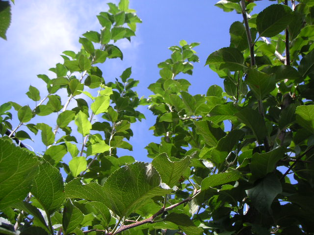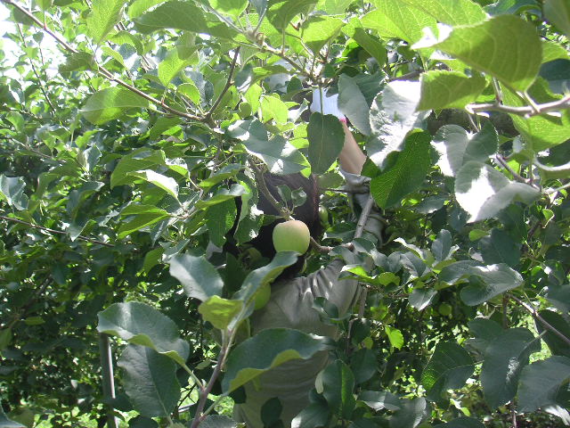 ![]() | 実がまだ小さくて青いリンゴ畑が今日の場所です。 |