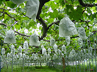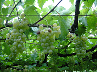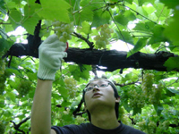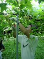 ![]() | こんな風に、一房の葡萄の粒の中には、鳥に食べられる等して、腐ってしまう場合があります。この写真で紫色になっている部分が腐っている粒で、それを、 |