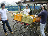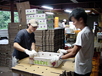 ![]() | 雨が多少強くなってきたので、屋根があるところで葡萄箱の組み立てをしました。単純作業なのですが、なぜかこれがとても楽しいんですね。30分ぐらいしかやってないというのはもちろんありますが、何が楽しいんだか、やってみないと分からないものです。 ところで、休憩のときに尾形さんの畑で作ったラフランスだけを使った100%ジュースをいただいたのですが、東京で売ってる100%ラフランスジュースとはまるでレベルが違います。絞る過程に大きな違いがあるとは思えないので、やはり尾形さん宅のラフランスがおいしい、という事だと思います。赤・黒・黄緑の色々な葡萄もいただきました。もう近所のスーパーの葡萄は食べれません。 |
