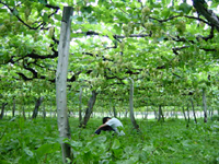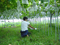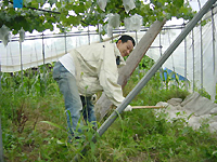 ![]() | 杭が打ってあるところや葡萄の木の周りは機械で入れず、尾形さんのところでは除草剤も使っていないため、下草を鎌で刈ることになります。 |