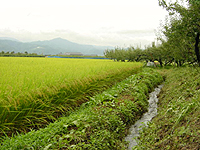 ![]() | 洋なし畑の隣の田んぼ。この日は小雨がぱらぱらと降っていました。 |