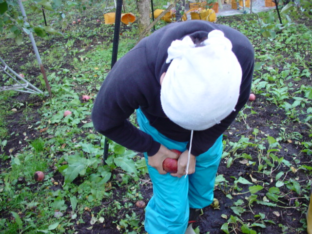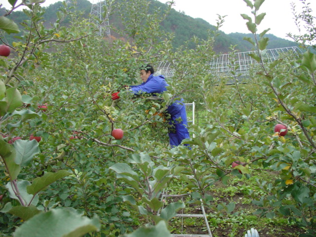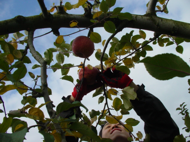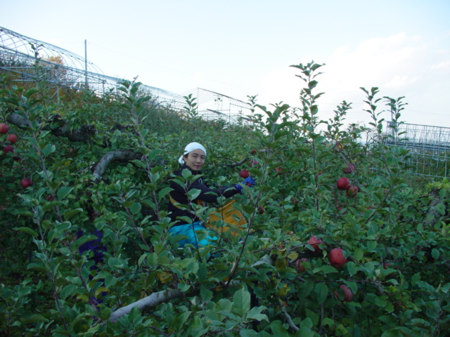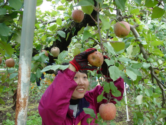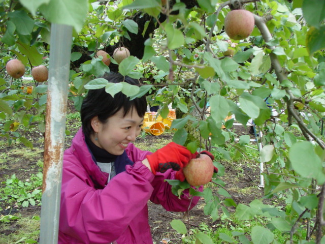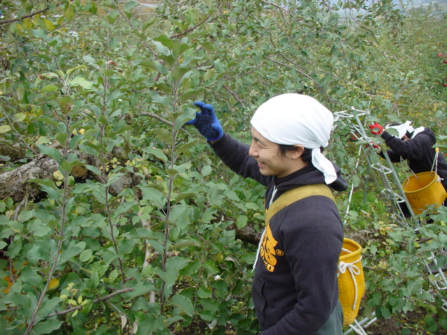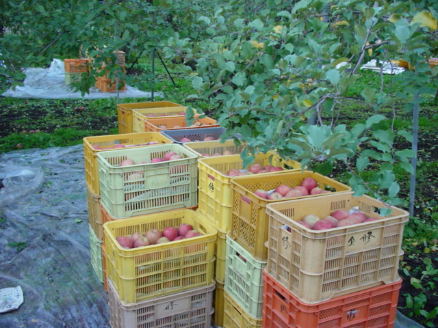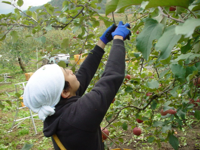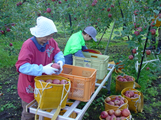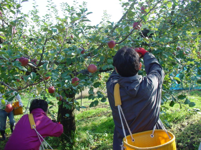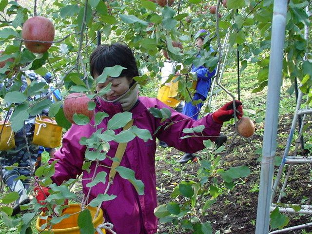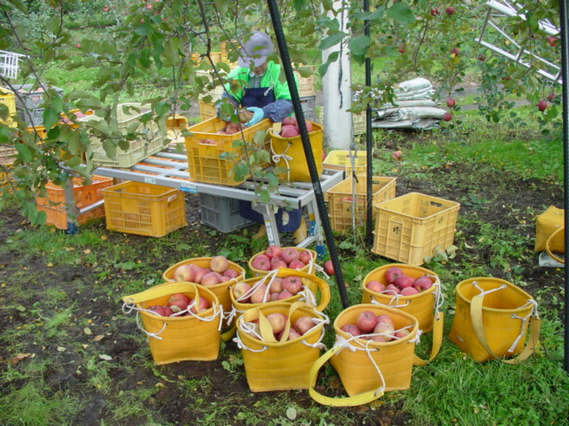 ![]() | もいだリンゴはしょっている黄色いカゴに傷をつけないようにそっと置いて |