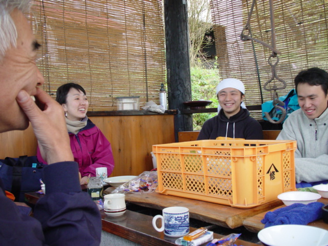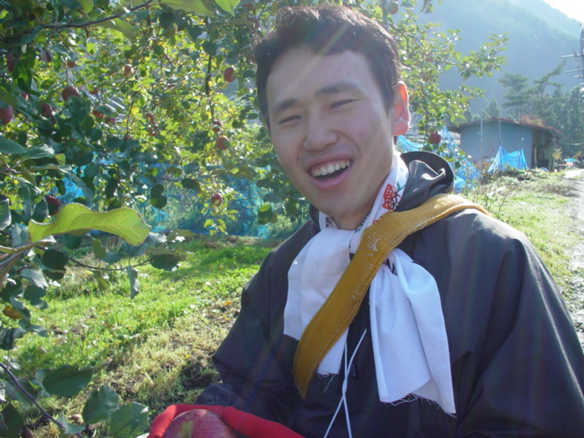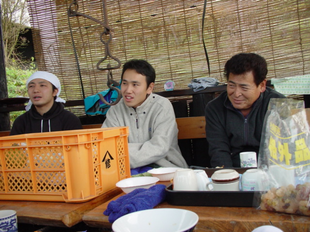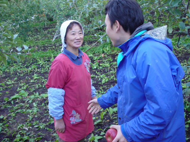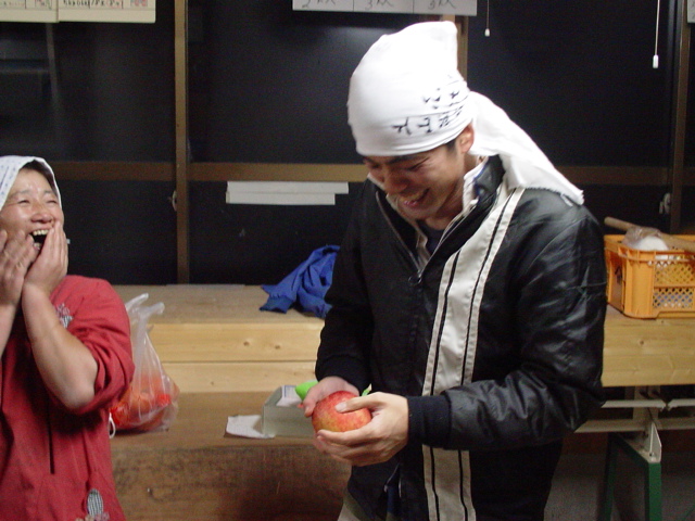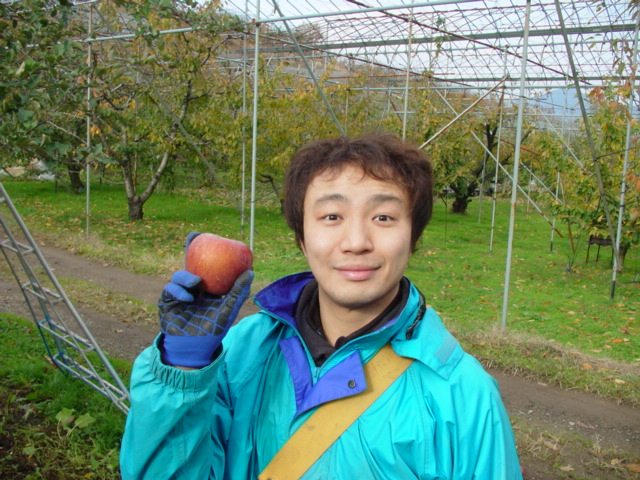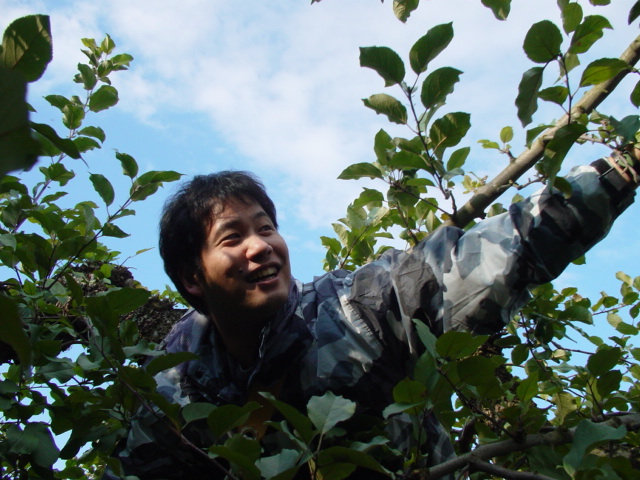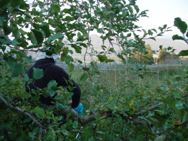 ![]() | 午前中で全てのリンゴをもぎ終わり小屋で長沼さんとしばし団欒。リンゴの木は10年くらいから収穫でき、35年から40年程度が収穫の寿命だそうです。古い木を土台にして新しい枝を挿し木にすることで序々に世代交代させます。 |