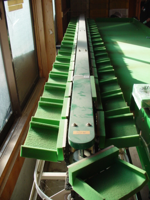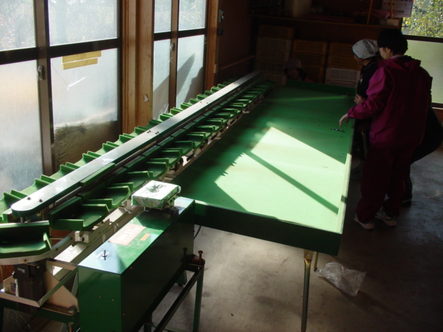 ![]() | 作業場の秘密兵器はリンゴの仕分け機でした。手前の重さセンサーに乗せることで指定した大きさごとに仕分けしてくれます。 |