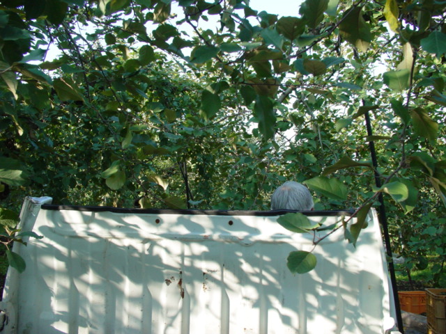 ![]() | 男性陣は果樹園に戻って収穫したリンゴのコンテナを作業場まで運びます。写真のトラックは果樹園の中を走行できるように一般のトラックの屋根を切り下ろしたもの。荷台から撮影。 |
