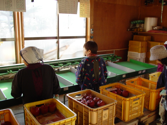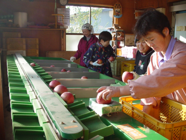 ![]() | 仕分けスペースではそのままリンゴとして出荷するものとジュースにするものに分けています。柄が付いていないなどもぎ方が悪いと大声で注意されます。 |