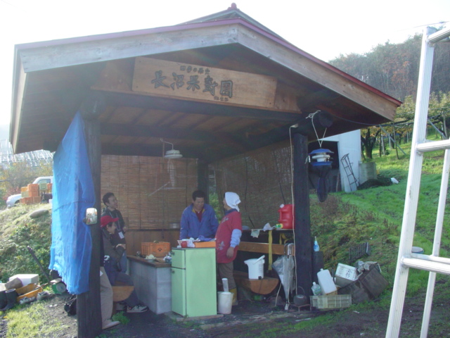 ![]() | 長沼果樹園、長沼さん手作りの休憩小屋です。前回はこちらでバーべキューをしました。 |