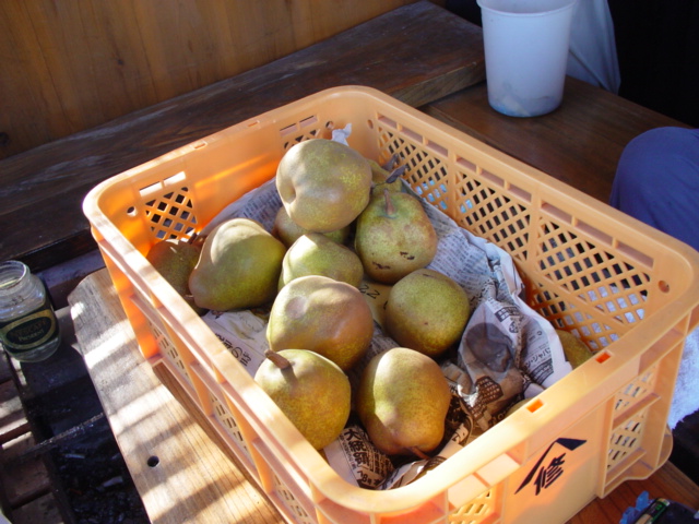 ![]() | 収穫する前に予約で一杯になってしまうという長沼果樹園ご自慢のラフランスです。こちらは休憩中に食べるもの。冷蔵庫に入れず、外でやわらかくなるまで熟しています。 |