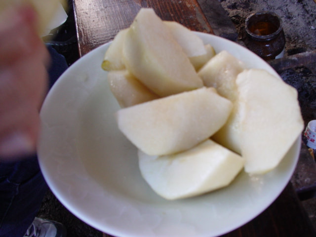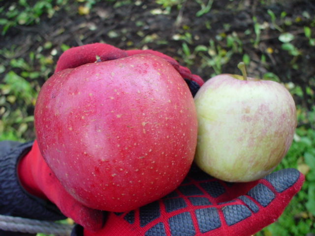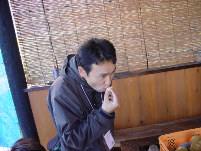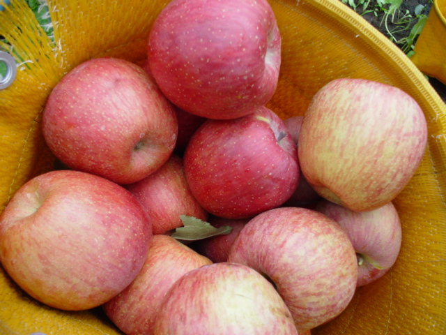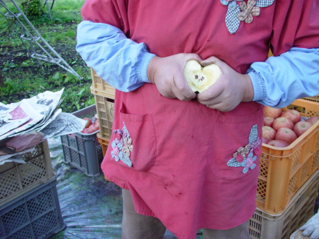 ![]() | もぎたてのリンゴはものすごく硬い。特に今年のリンゴは比較的硬いらしい。 |