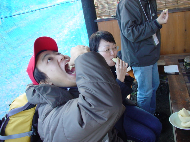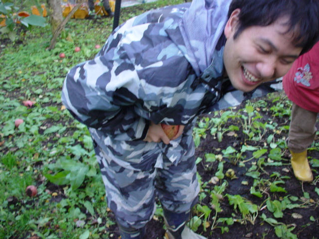![]() | で芋ほり班の男性陣もリンゴ割りにチャレンジ |
