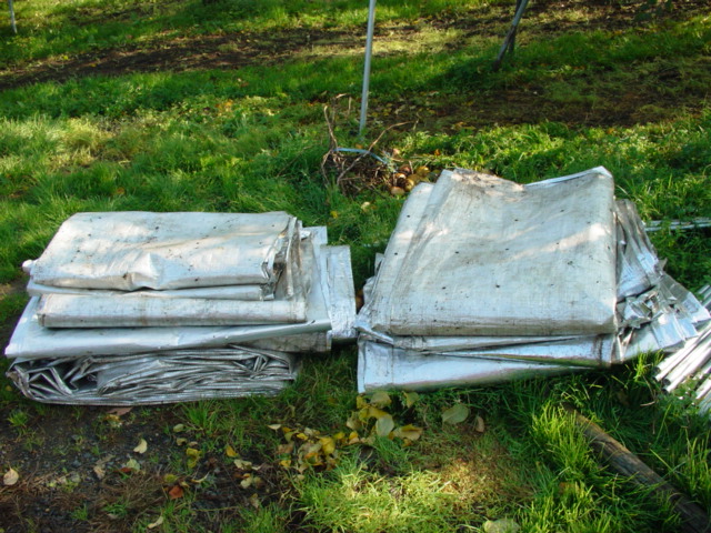 ![]() | 下のリンゴにも陽が当たるように敷いてあった銀シートです。収穫前にはずし回収します。 |