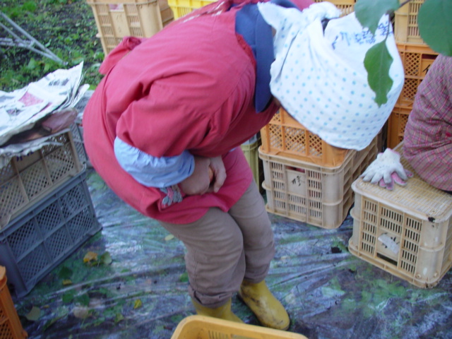 ![]() | 雨が降ってきそうになると「高いところのリンゴから先にもぎるように」など、仕分けしながら実は長沼お母さんが大きな声で収穫組を指示しています。 |