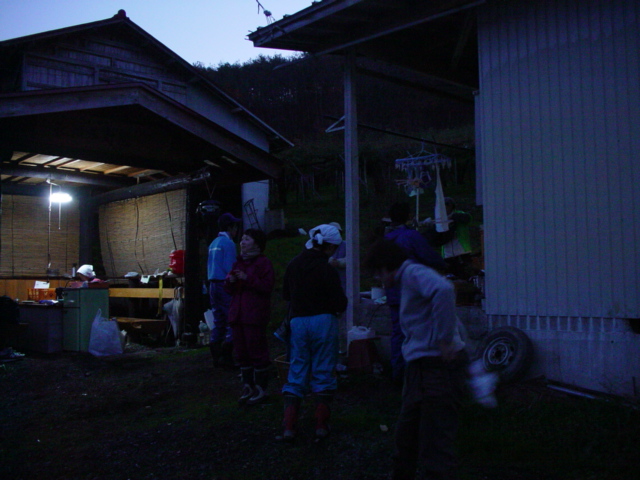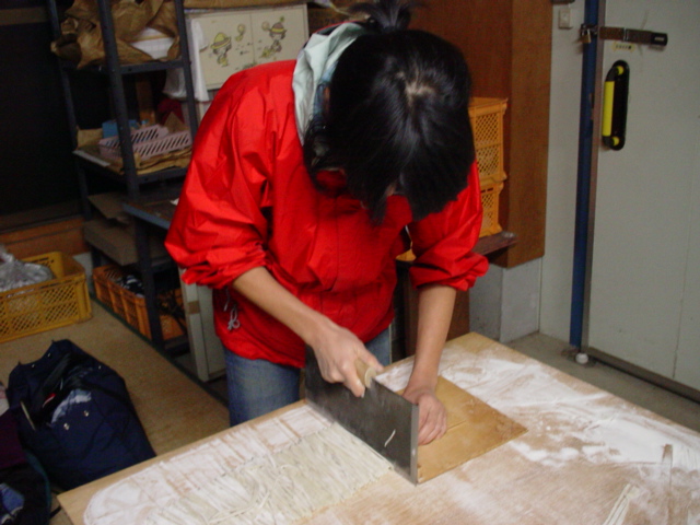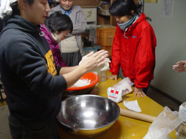 ![]() | 夜は長沼さん宅の隣にある作業場で、芋ほり班と合流して蕎麦打ちです。 |