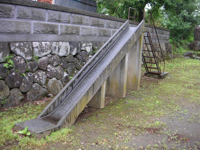 ![]() ![]() | 茂吉の生家の目の前の名もない神社。コンクリートでできたスベリ台。 |