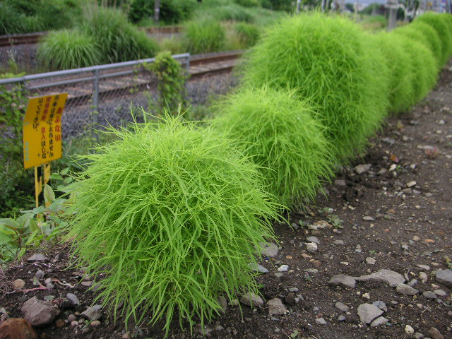 ![]() | 線路沿いのモリゾーとキッコロ。 ほうき草といって、その名前の通り、枯れたら後にそのまま束ねればほうきになります。 |