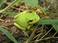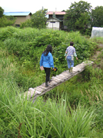 ![]() | 大場さんの自宅の裏から、小さな手作りの橋を渡って葡萄畑へ。ここ小穴地区には何度も来たことがありますが、このあたりはちょっと雰囲気違って、山が目の前にあって、小川があって、小さな神社があって、日本人が感じる日本の田舎という雰囲気。 |