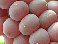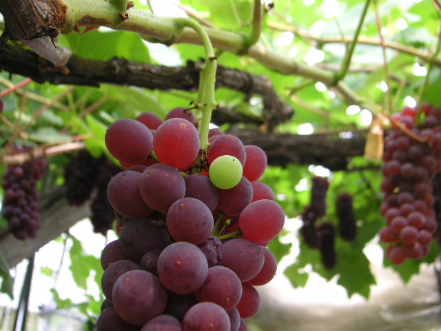 ![]() | ぶらさがってる葡萄の房の中で、こういう緑の粒が混じってるものが時々あります。 |