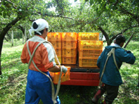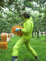 こうやってタスキを使って、直接ケースを抱えて、その中にもいだラ・フランスを入れていきます。1ケース12キロくらいになるので、慣れるまではけっこう肩に食い込みます。 |