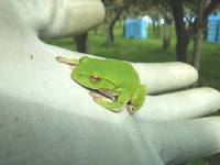 かえるを発見。果樹園の緑に染まったような鮮やかな緑色です。 |