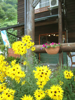 いつも花に囲まれた佐藤果樹園のオープンカフェ。 |