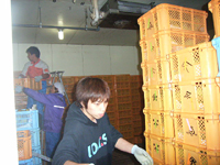 こうやってラフランスが入ったケースを作業小屋に運んでいきます。 作業小屋では重さ、大きさ、傷の状態などで仕分けしていきます。仕分け作業を手伝っていたメンバーによれば、息つく暇もないくらいの流れ作業だったそうです。 |