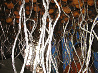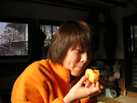 ![]() | 写真がイマイチなんですが干柿部屋です。 そのむせかえるような干柿の匂い、いつも食べてる柿と、見たことのある干柿の間ぐらいの大きさにしぼんだ柿が吊るされているジャングルのような光景に、参加者はおとぎ話の世界に入り込んでしまったような表情。ディズニーランドに初めて行ったときのことを思い出してください。アレです。 |