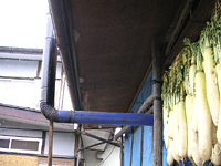 ![]() | 干柿を乾燥させるために木を燃やした時に出る煙を、この煙突から出しています。すると、途中で水蒸気が冷えて、煙突から雫がもれてポタポタ落ちてきます。 ちなみに手前の大根は干してるところ。 |