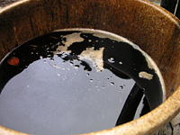 ![]() | バケツ一杯にたまった真っ黒な液体、これが「木酢液」です。昔はこうやって天然の農薬を作っていたんですね。 バケツの中に小指をちょっとだけつっこんで、口に入れてなめてみました... 確かに虫が寄りつかなそうです。 |