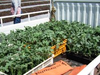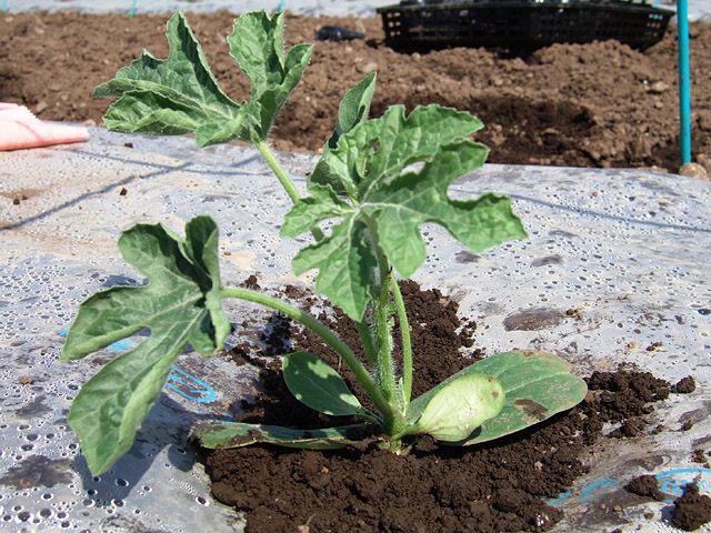 今日植えるスイカの苗。ブランド名は丸西スイカ。 外側は緑に縞模様が入っていて、中は真っ赤なスイカです。 |