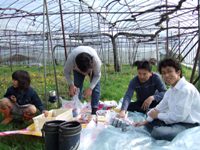 作業が一段落したところで、スイカ畑の隣にあるデラウェアの ハウスの下でひとやすみ。天気がいいし、ちょっとしたピクニック気分♪ |