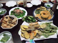 畑でとれたお野菜や山菜の天ぷら、煮物、おひたしなどをみんなで