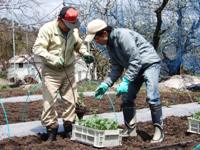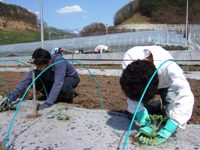この苗を畑いっぱい(6棟分)植えていきます。それも、苗を1本ずつ! 両手で使うスコップみたいな道具を使って丁寧に。