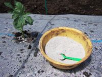 スコップで植えた苗の周りには粉末状の薬を巻きます。 苗が虫に食われないようにするため。 |