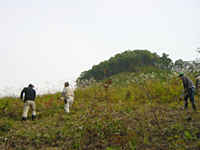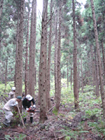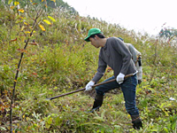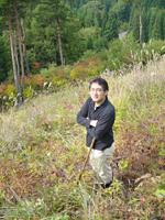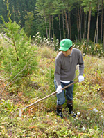![]() | こんな感じで鎌で下草を刈っていきます。植林した木に栄養分と日光がうまくいきわたるように、木が小さい時にはこうやって下草を刈っていくわけですね。 |