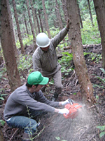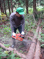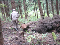 ![]() | いよいよ間伐。まずはプロが普通にバリバリとチェーンソーで切っていきます。 |