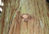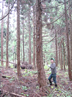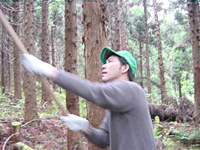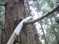 ![]() | 2メートル以上ある鎌を使って、太陽の光があたらならなくて枯れてしまった下の方にある枝を落としていきます。こうやって枝打ちしないと、枯れた枝の付け根が腐ったり、虫が入ったりして、付け根のところが黒くなってしまって商品価値が下がってしまうんだそうです。 |