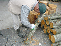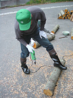 ![]() | 「原木へのコマ打ち」って何のことかと思ったら、まずこういう原木(たしかハンの木)にドリルで穴を開けます。 |
