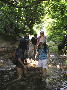 ![]() | 川の中を進めない場所もあるので、ジャングルみたいなところをモリモリと進んでいきます。やはりスポーツサンダルとリュックは必須。ビーチサンダルとかだとかなり危険。 |