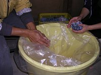 足でふむのはたいへんなので、両手でつぶしていきます つめたくて手がいたい。 |