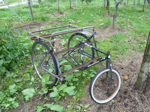 吉田さん自作の移動式収穫台がうなります。 |