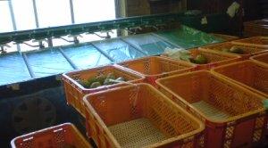 機械とカゴの間に4人立ち、 流れ作業的に転がってきた果実を カゴに並べていき、いっぱいに なったカゴはもう1人が外で回収 して積み上げます。 積み上げたカゴはそのまま隣の 冷蔵の貯蔵庫へ。 この作業効率、凄まじいです。 |