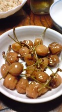 (おちょこでは間に合わない のでしょうか?)、 イナゴの佃煮 (目が合って躊躇しましたが 海老だと思えば食べれました) 山菜の炒め煮、お漬物等 さくらんぼの酢漬け(右) (お手製。梅干のようにおにぎり の具にするそうです。あとひく 酸味でついつい手が伸びてました) |
