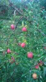 ホントにとんがってるねーと 車内もすっかり和み、これから 始まるファームステイに胸を 躍らせていました。 柵も何にも無い放し飼い(?)の りんごの木(右)一個でいいから~の もぎたい衝動を必死に抑えました。 |