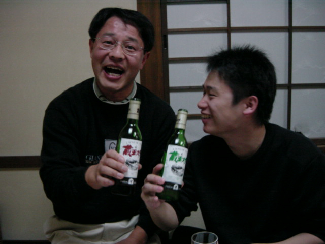 ![]() | 手に持っているのは地元産のワイン。右の人は干柿班。左の人が上山市役所の井上さん。田舎時間の活動を毎回支えて頂いています。井上さんがいなければ田舎時間も生まれませんでした。 |
