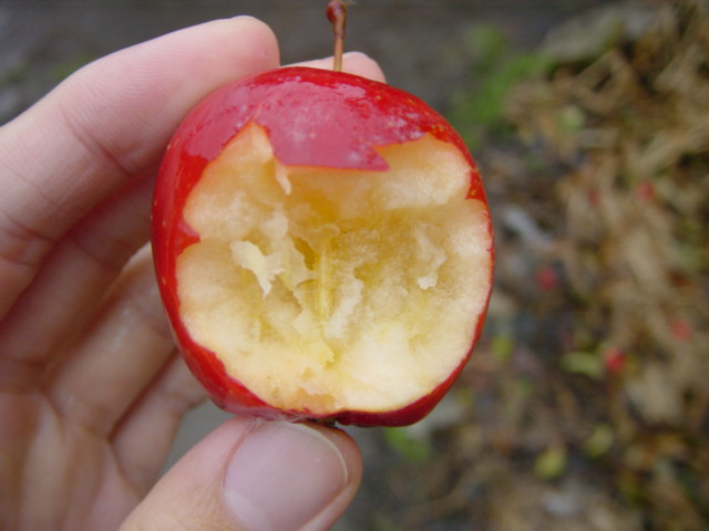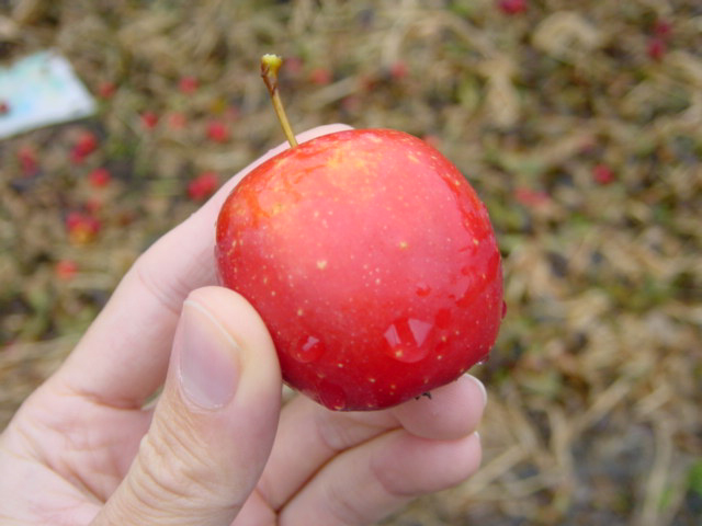 ![]() | 柿を干している庭への路に姫りんご?を発見。 「出荷用じゃないので、食べていいよ~」とのこと。 |