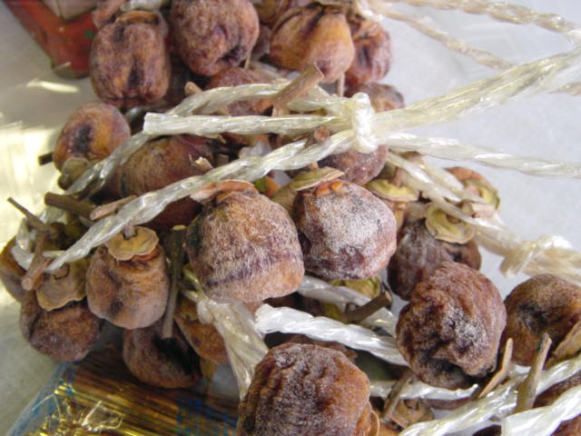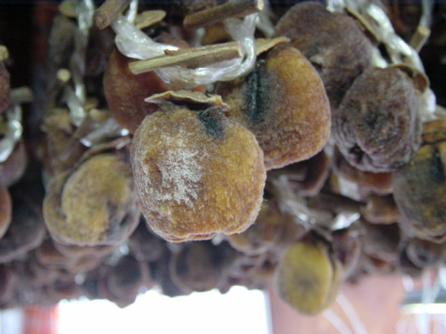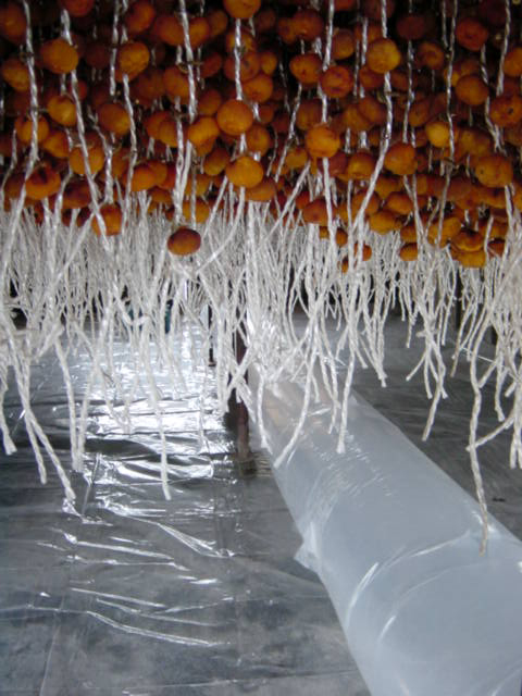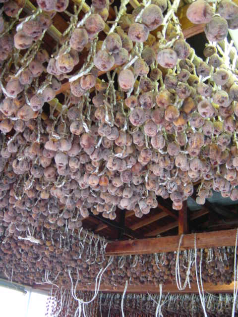 ![]() | 遂に登場。乾燥しはじめたばかりの干し柿。ジューシーなお姿に惹かれ、一口ぱくり。 予想通り、「あま~い!」と思いきや、、、ジワリジワリと渋みが…。舌と口の中がパサパサ、シブシブ。 干せば干すほど、この渋みが消えるそうです。 |